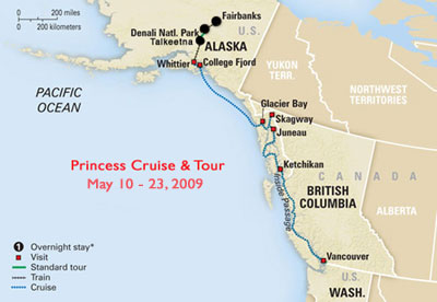 We had a wonderful 12 day trip to Alaska. We arrived a day early in Vancouver and wish we could have spent more time. We cruised the inside passage of Alaska from Vancouver to Whittier. From there we took the train to Talkeetna and had clear views of Mt. McKinley for the rest of our trip. We saw a bunch of animals from afar in Denali and were surprised with Fairbanks.